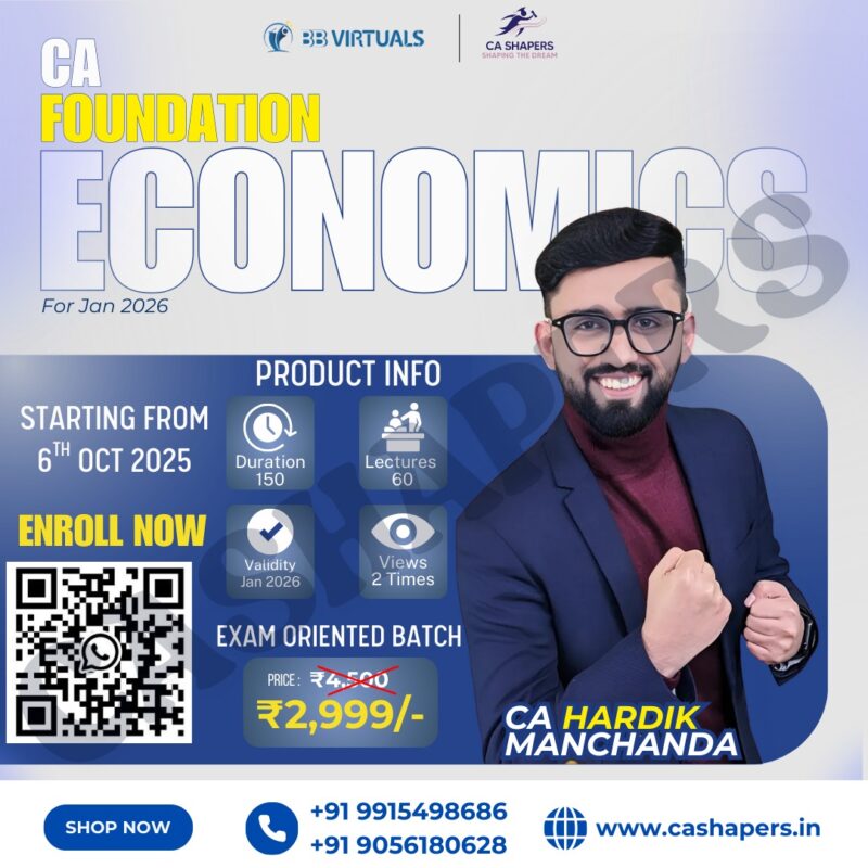 | 1. Exam-Oriented Batch - Adv Accounts, Law, Costing, DT , GST, FM, SM, Audit 2. 100% syllabus coverage as per ICAI module 3. Unlimited Validity with 1.5 Views 4. Applicable for Sep 2025 5. Lectures in English-Hindi Mix Language Useful For: a. All those students who are starting classes first time after foundation b. All direct entry students from B com or from any other stream |