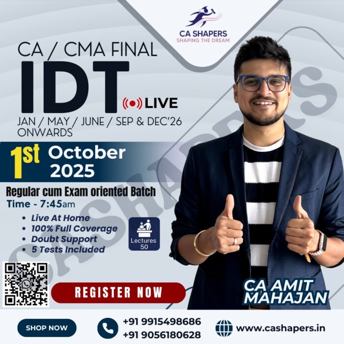 1. Regular In-Depth Batch -Â Live+Recorded Batch started from 18th Jan 2025 2. 100% syllabus coverage as per ICAI Study Module 3. Applicable for Jan/May/Sep 2026 & 2027 Attempts 4. Two-Time Views with Unlimited Validity 5. Practice of Maximum Questions in Class 6. New Simplified Concept Book (350 Pages) 7. Class Test with checking facility. 8. Every 15 Days Zoom Guidance |